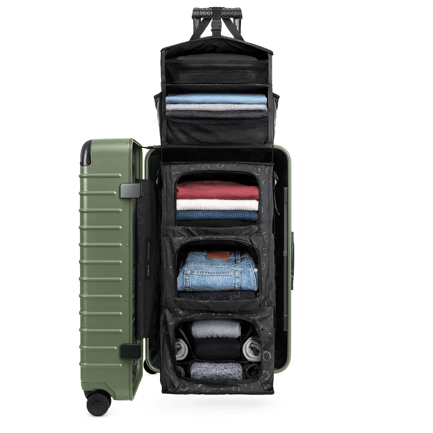 It comes with (2) Carry-On Closets and (2) Check-In Closets for tidy packing for you and a partner to enjoy hassle-free escapades. The roomy Venture Backpack is ideal for day excursions, while the chic Voyager Weekender is your top choice for short trips. Fashionable, eco-friendly, and incredibly practical, this bundle has all you need to journey smarter, from lengthy flights to quick escapes—created for those who desire effortless and fashionable travel!Â
